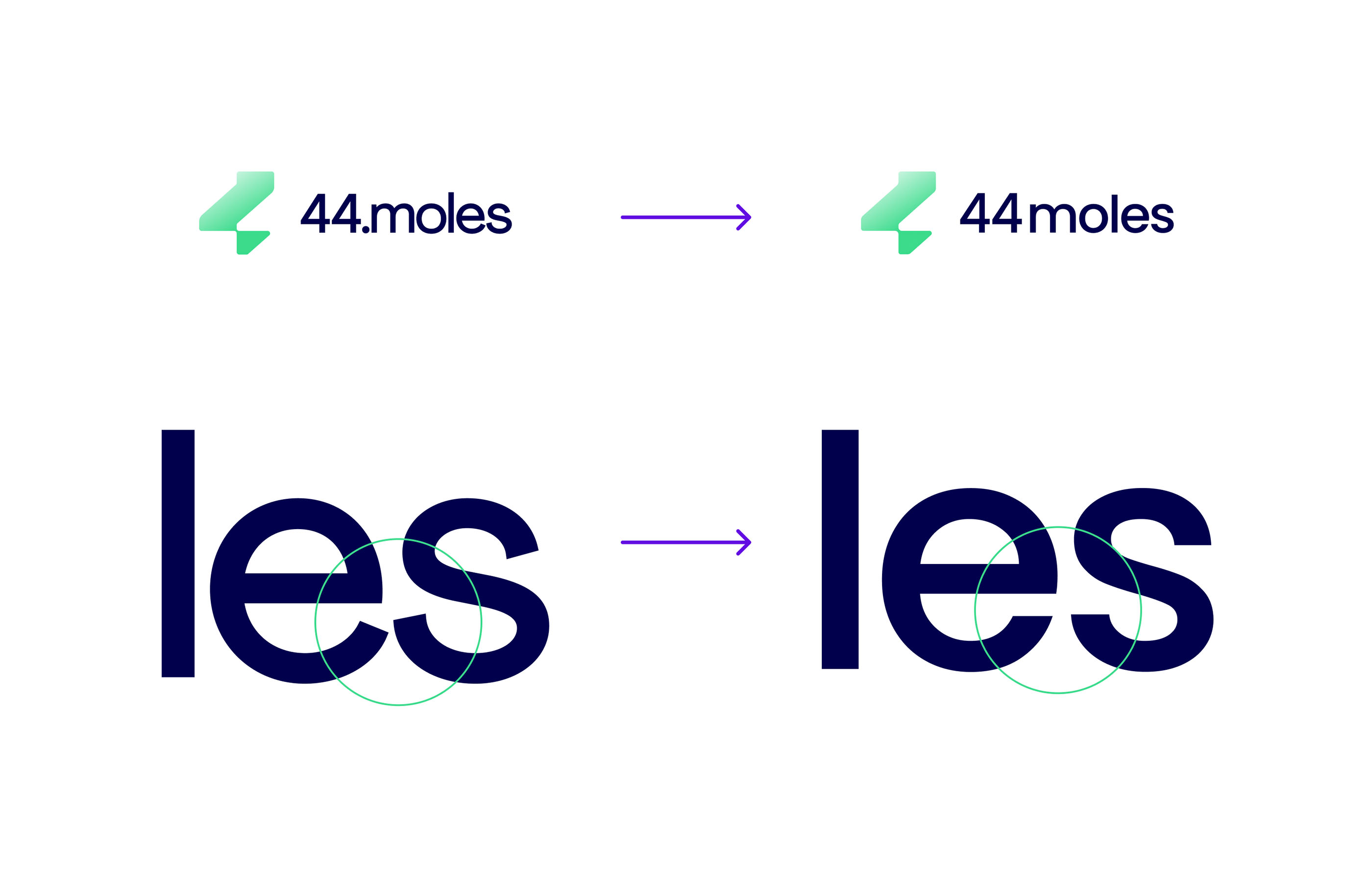 Originally, the logo contained a dot. As nobody said '44 dot moles' just '44moles' removing the dot was a logical step and simplified the overall look. I also changed to the Poppins font here for better typography alignment.
