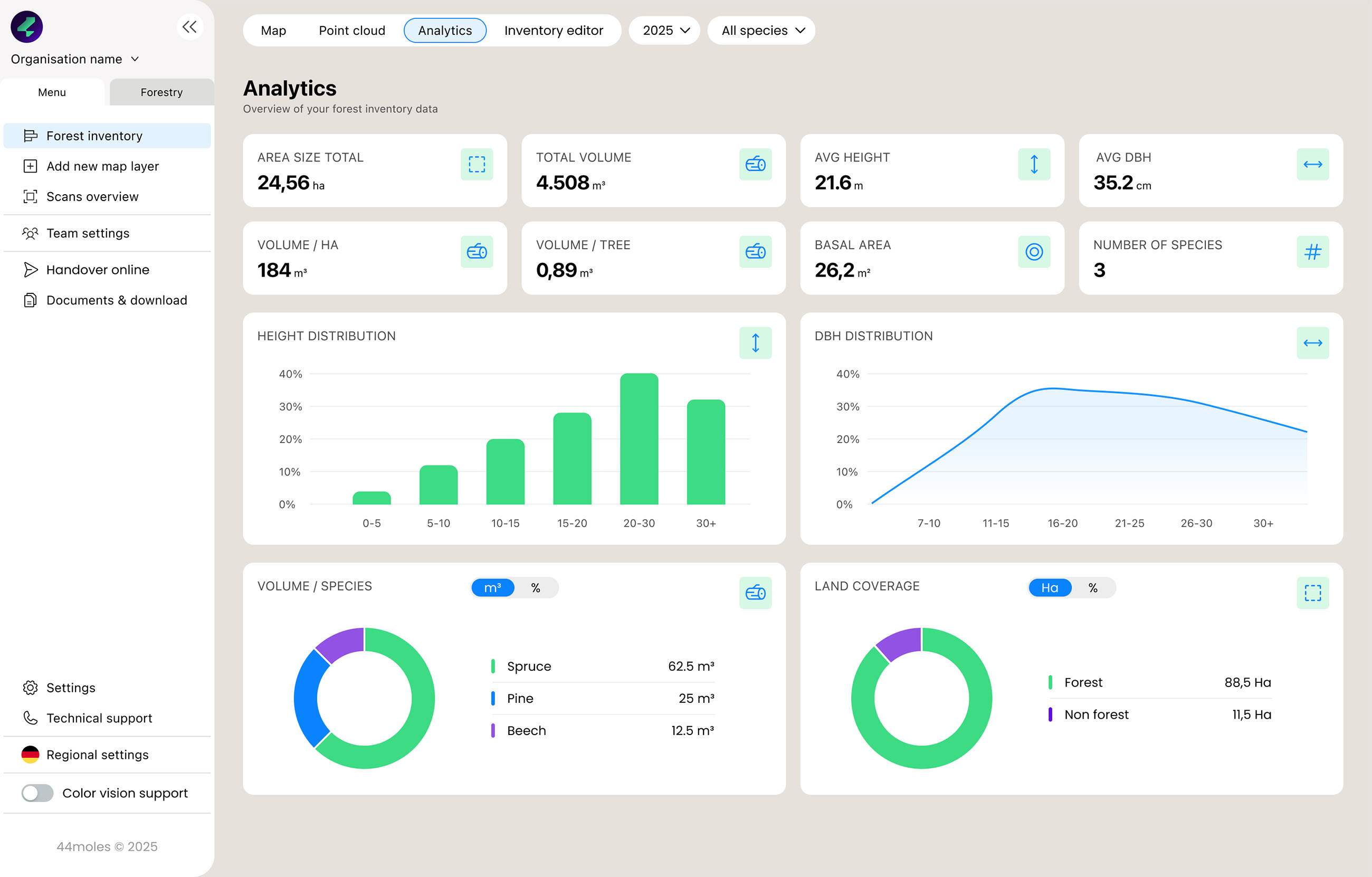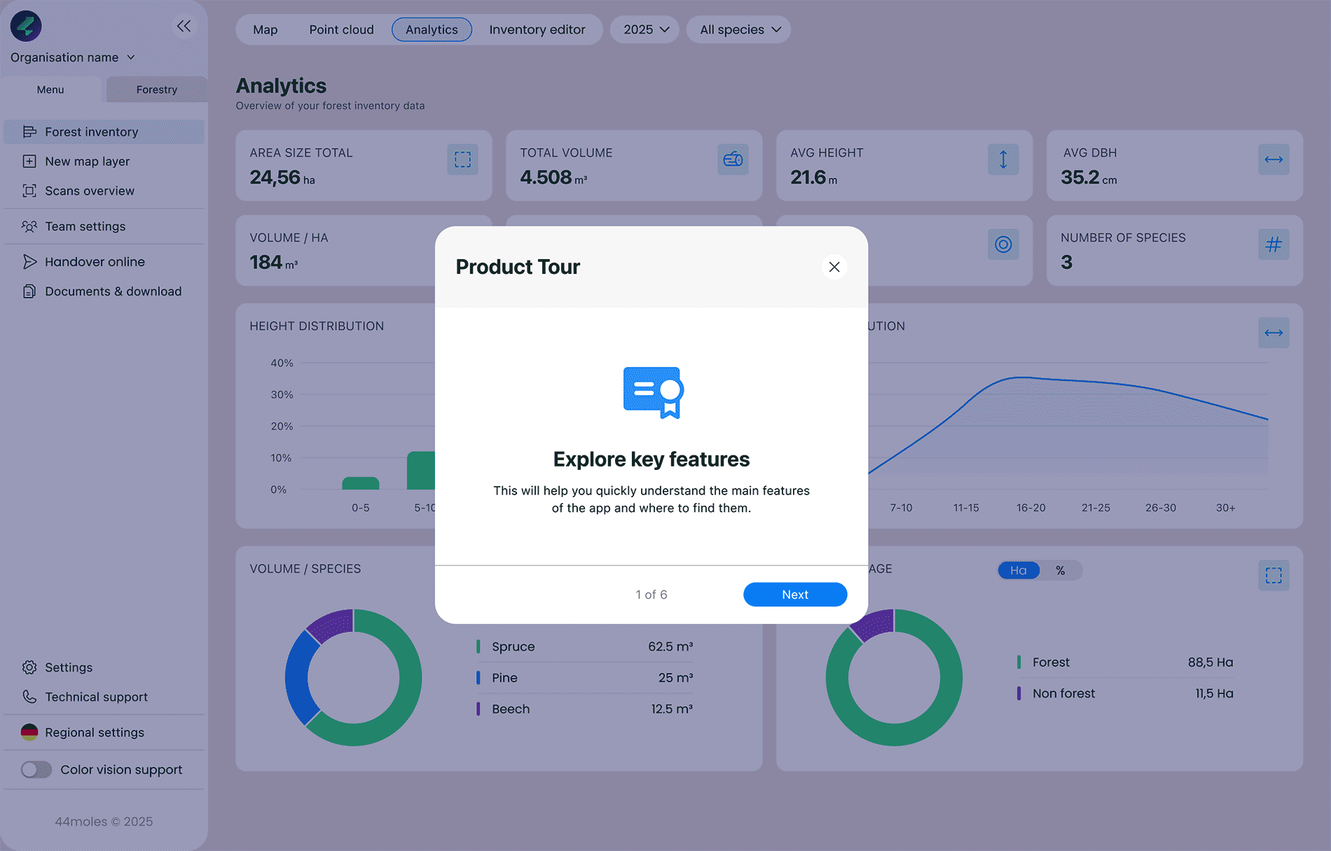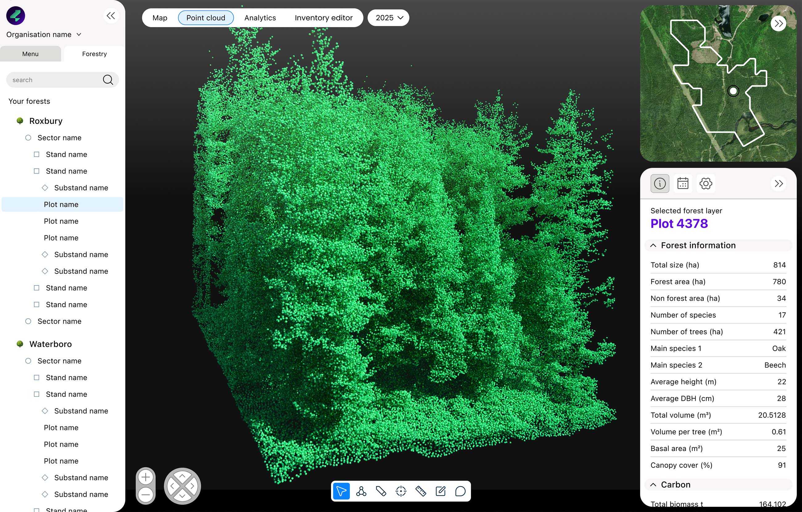 Challenge: Build a digital forest inventory (DFI) application from 0 to 1 that translates LiDAR scans and advanced backend data into a clear, interactive forestry tool. The goal was to turn highly complex spatial and analytical data into a high-end product that supports mapping, point-cloud exploration, analysis, and inventory management.